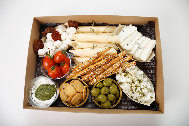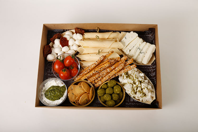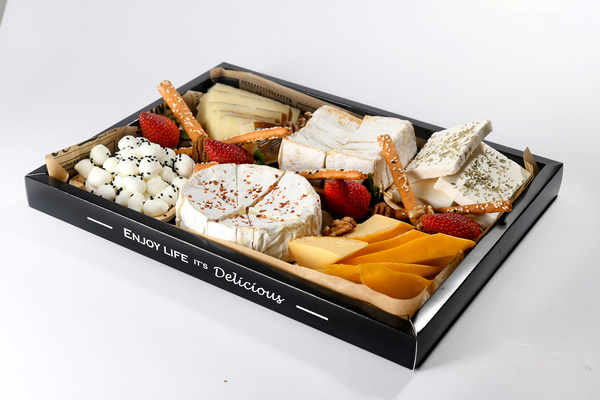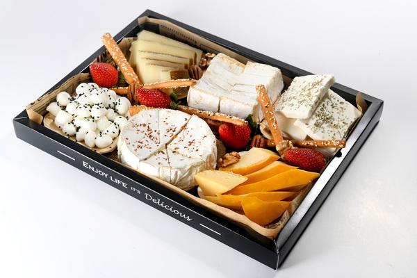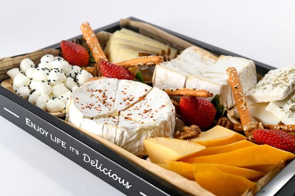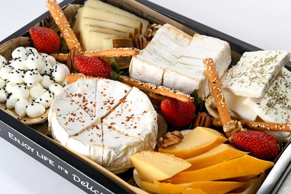 מגש מיקס גבינות מיוחדות – 6 סוגי גבינה, מקלות מלוחים, פרי העונה