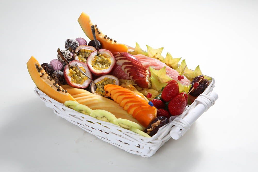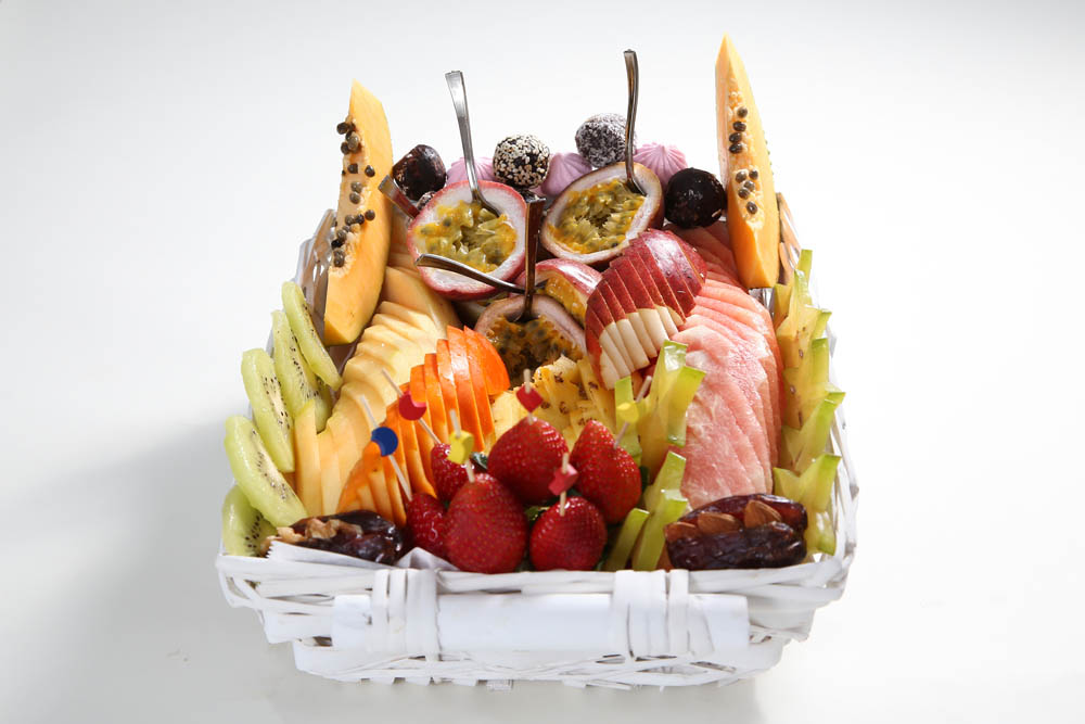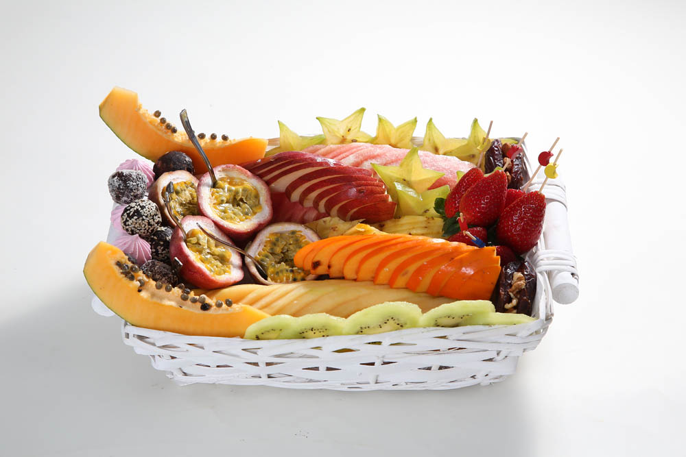 סלסלת פיקניק – מבחר פירות אקזוטיים ופירות העונה חתוכים ומעוצבים, מגיע עם מפיות וסכום